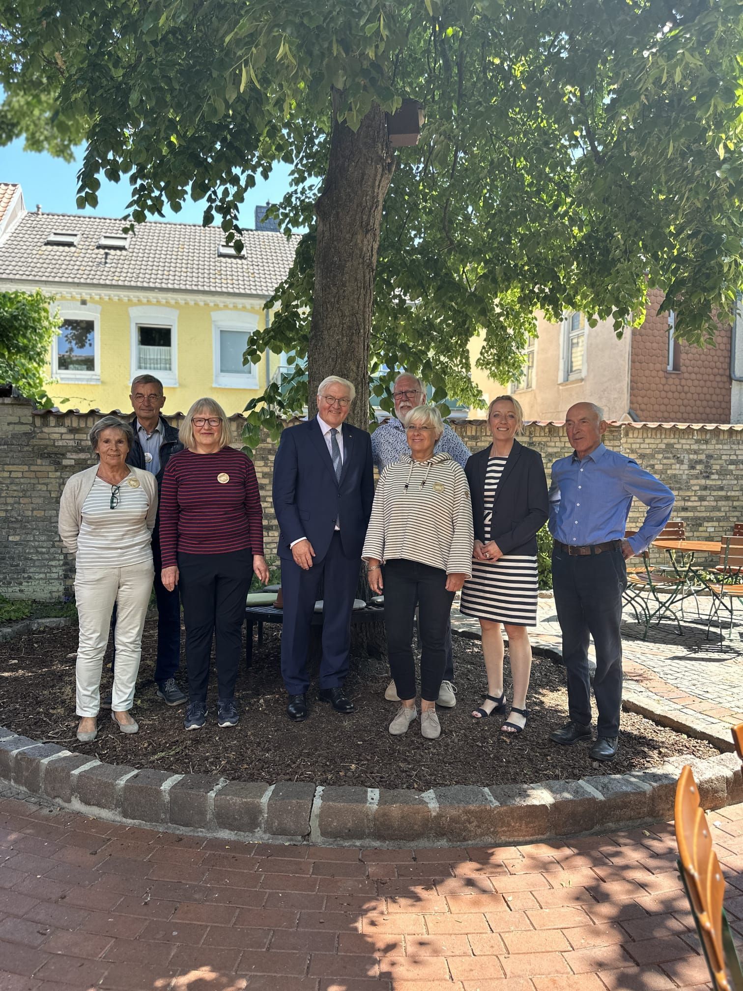 Am 13. Juni hatten wir hohen Besuch. Bundespräsident Frank-Walter Steinmeier hatte seinen Amtssitz für 3 Tage nach Eckernförde verlegt und uns am ersten Tag seines Aufenthalts zusammen mit unserer Bürgermeisterin Iris Ploog besucht. Alle Vorbereitungen des Besuchs unterlagen strikter Geheimhaltung, kompletter Sicherheitsüberprüfung des gesamten Geländes inklusive Inhalt durch Spürhunde und Bombenexperten und strengster Zugangsregelung. Der Besuch war bis ins Detail durchgeplant. Von den 6 anwesenden Vorstandsmitgliedern, die nach vorheriger Sicherheitsüberprüfung Zugang zum Gelände hatten, durften nur Katharina Mahrt und Manfred Rower den Bundespräsidenten herumführen. Außer dem Begleittross von knapp 20 Personen waren 2 Fernsehteams zugelassen, die gesamte schreibende Presse musste draußen bleiben. Zum Abschluss gab es ein Gruppenfoto im Garten. Wir sind sehr stolz auf diese Anerkennung unser aller Vereinsarbeit und möchten besonders unserer Bürgermeisterin für diese Auszeichnung danken.